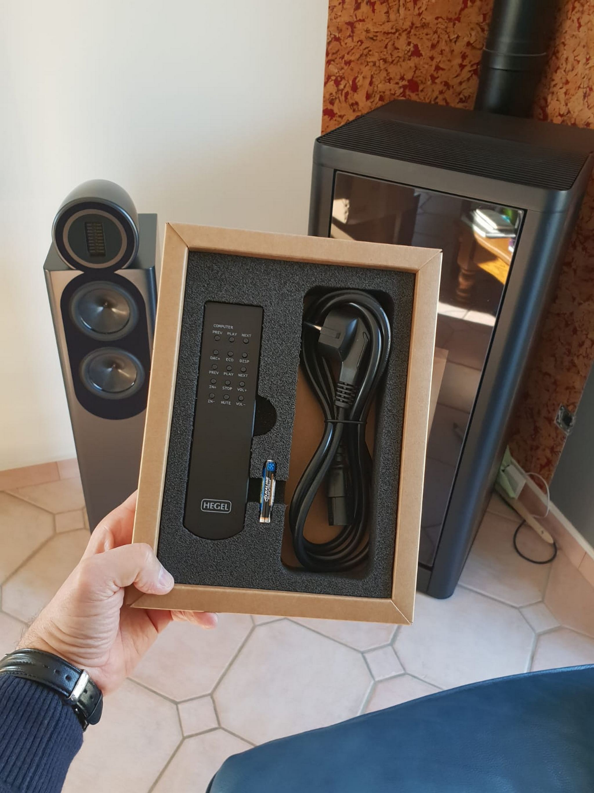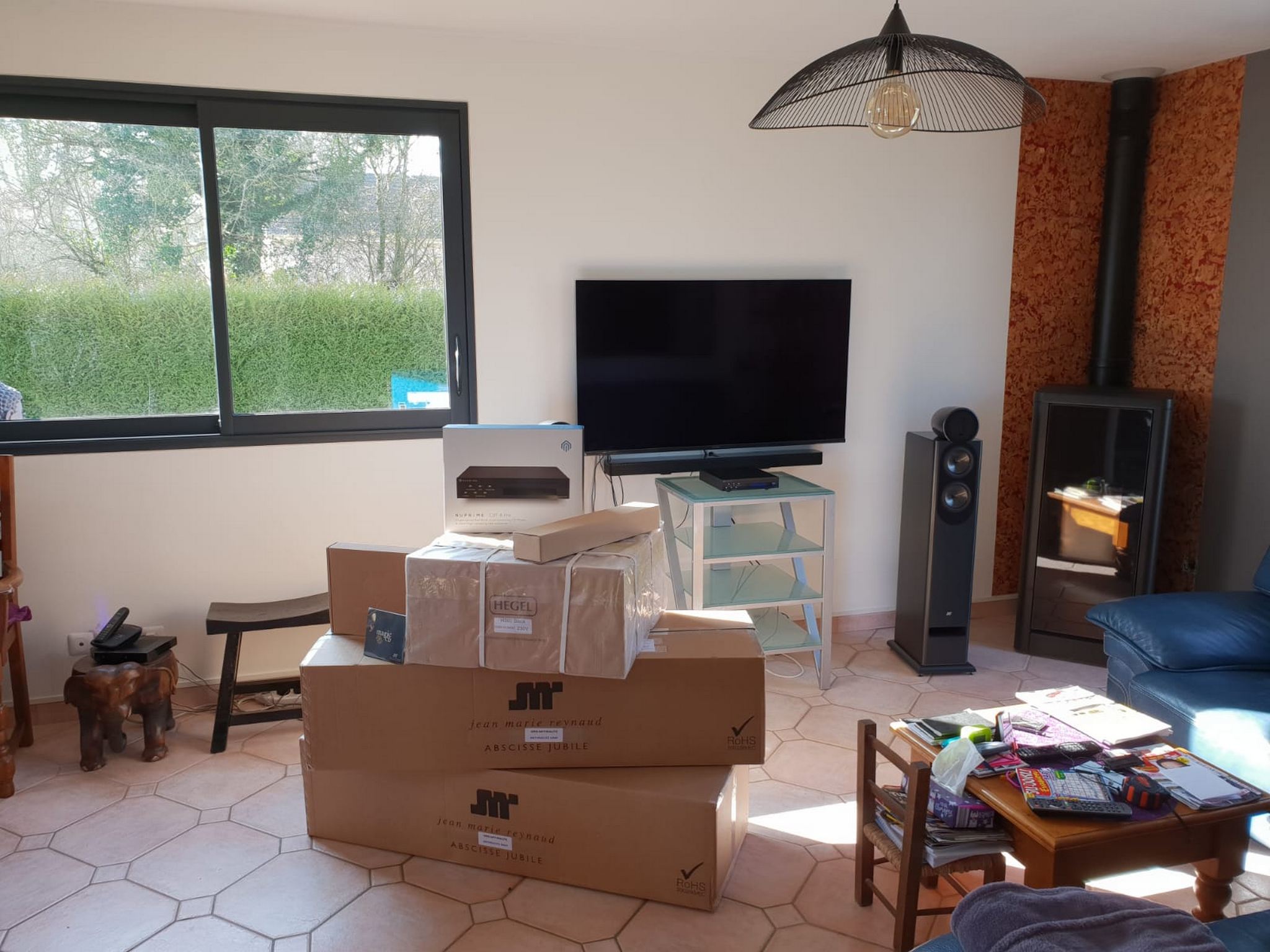 Ecoutes, validation, commandes, réception des matériels, et enfin direction la Normandie pour une belle journée d'installation. Nous lui avons livré et mis en place son système aujourd'hui: celui ci se compose d'une paire de JMR Abscisse Jubilé amplifiées par un amplificateur intégré Hegel H360, un transport cd NuPrime CD-T 8 PRO, du câblage d'enceintes JMR, et une barrette et un cordon secteur Actinote.