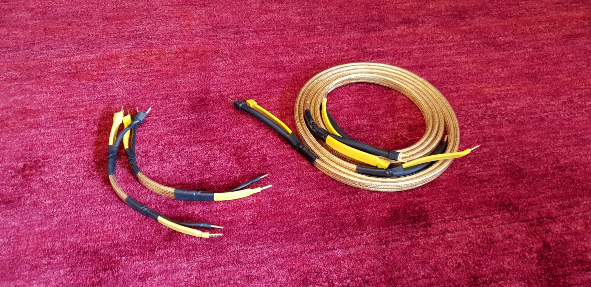 Coté câbles d'enceintes: Analysis Plus Golden Oval d'une longueur de 2m10, avec des terminaisons banane coté ampli, et fourches coté haut-parleur.