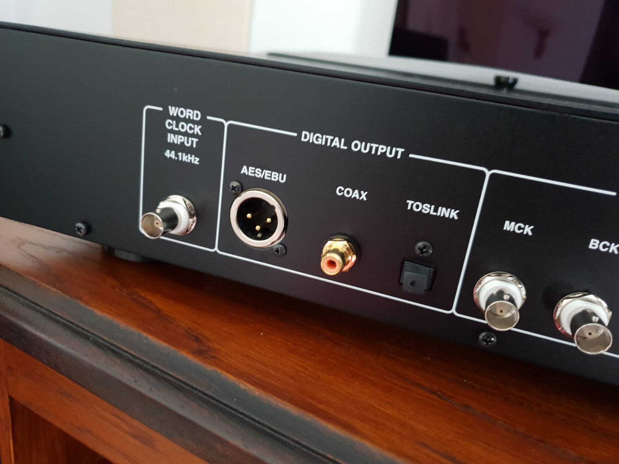 La connectique propose les sorties digitales standards comme le RCA ou le Toslink, et aussi l'AES-EBU que l'on retrouve sur les meilleurs productions. Il est également possible de lui connecter une clock et une liaison Superlink.