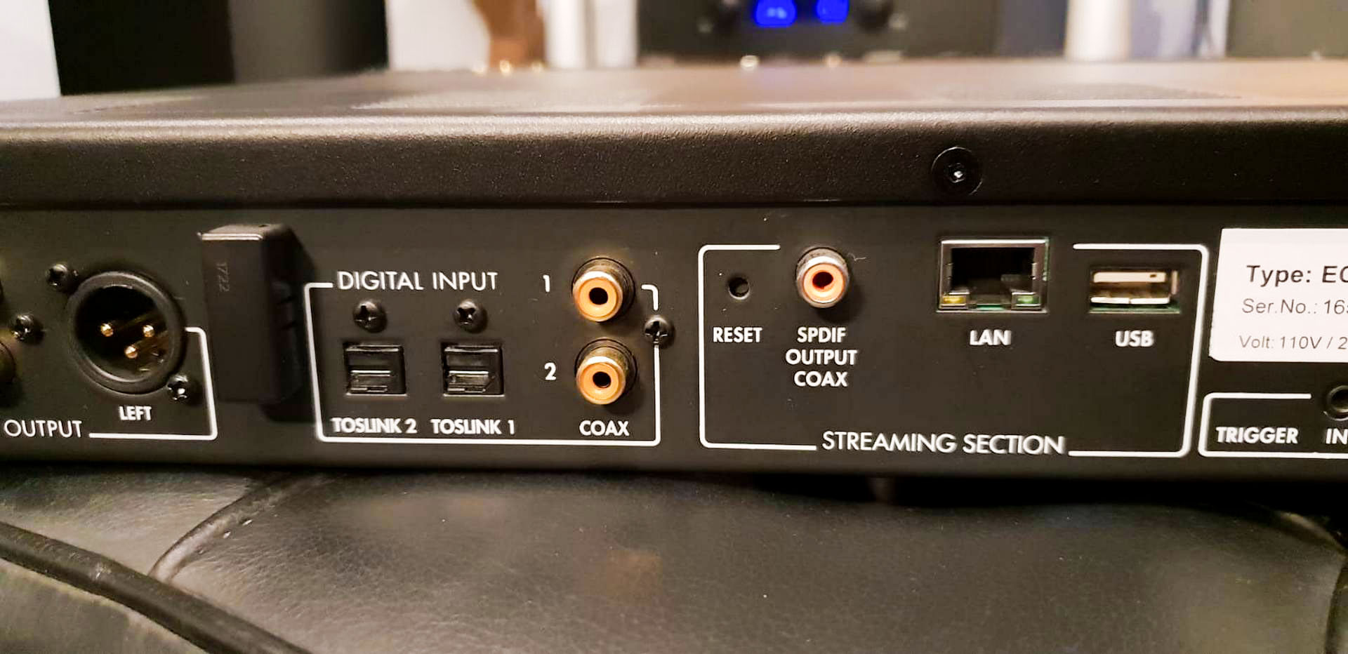 La connectique est plus que complète avec une foule d'entrées digitales permettant de parer à toutes situations; quant aux sorties analogiques, les connectiques RCA et XLR sont proposées. Il peut également piloter un bloc de puissance grâce à sa gestion de volume.