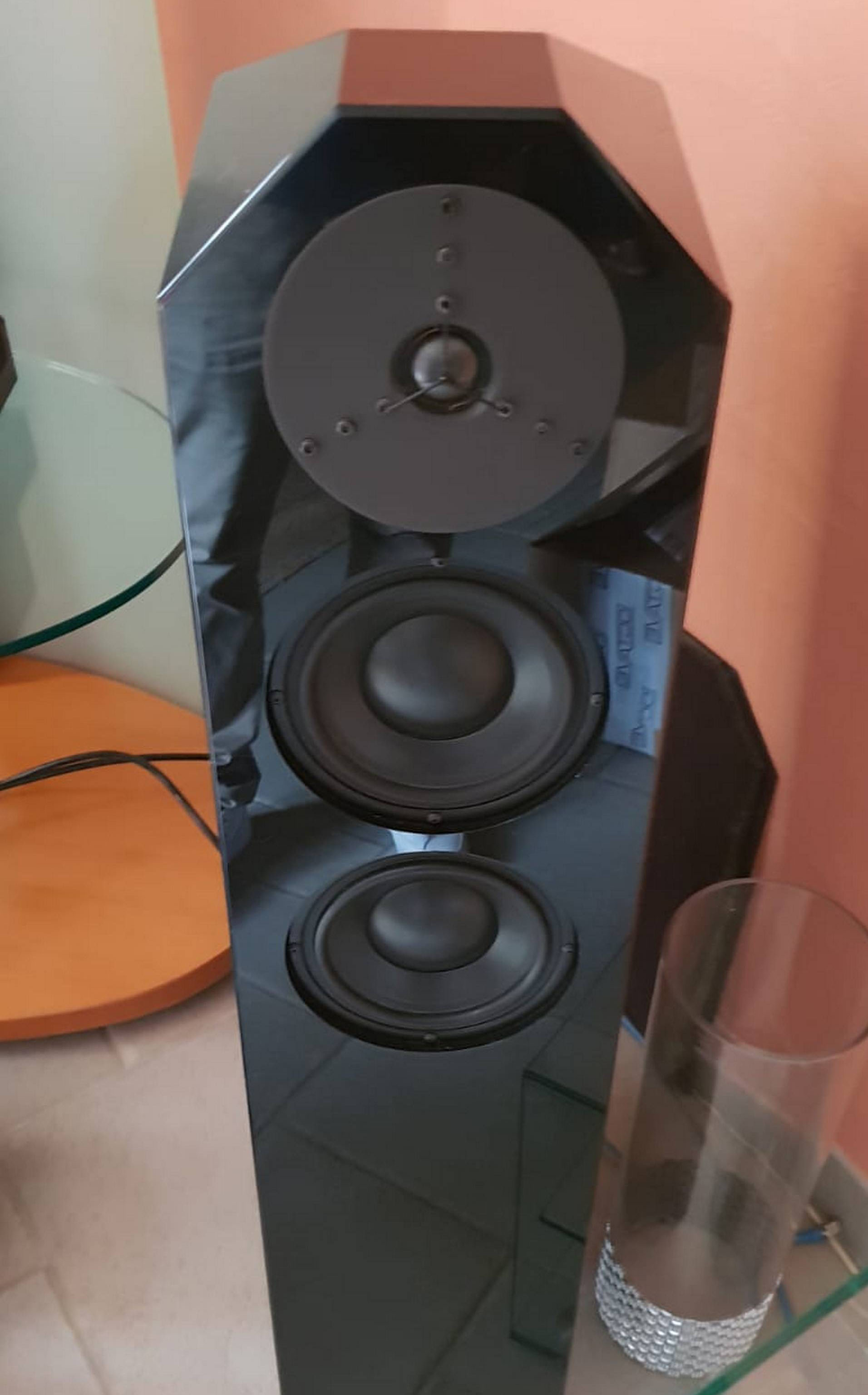 Les enceintes sont des Egglestonworks Fontaine très musicales, au look très angulaire. Elles distillent une belle musicalité sans agressivité, avec une gestion du registre grave très plaisant, le tweeter et le médium ne sont pas en reste avec des composants Morel.