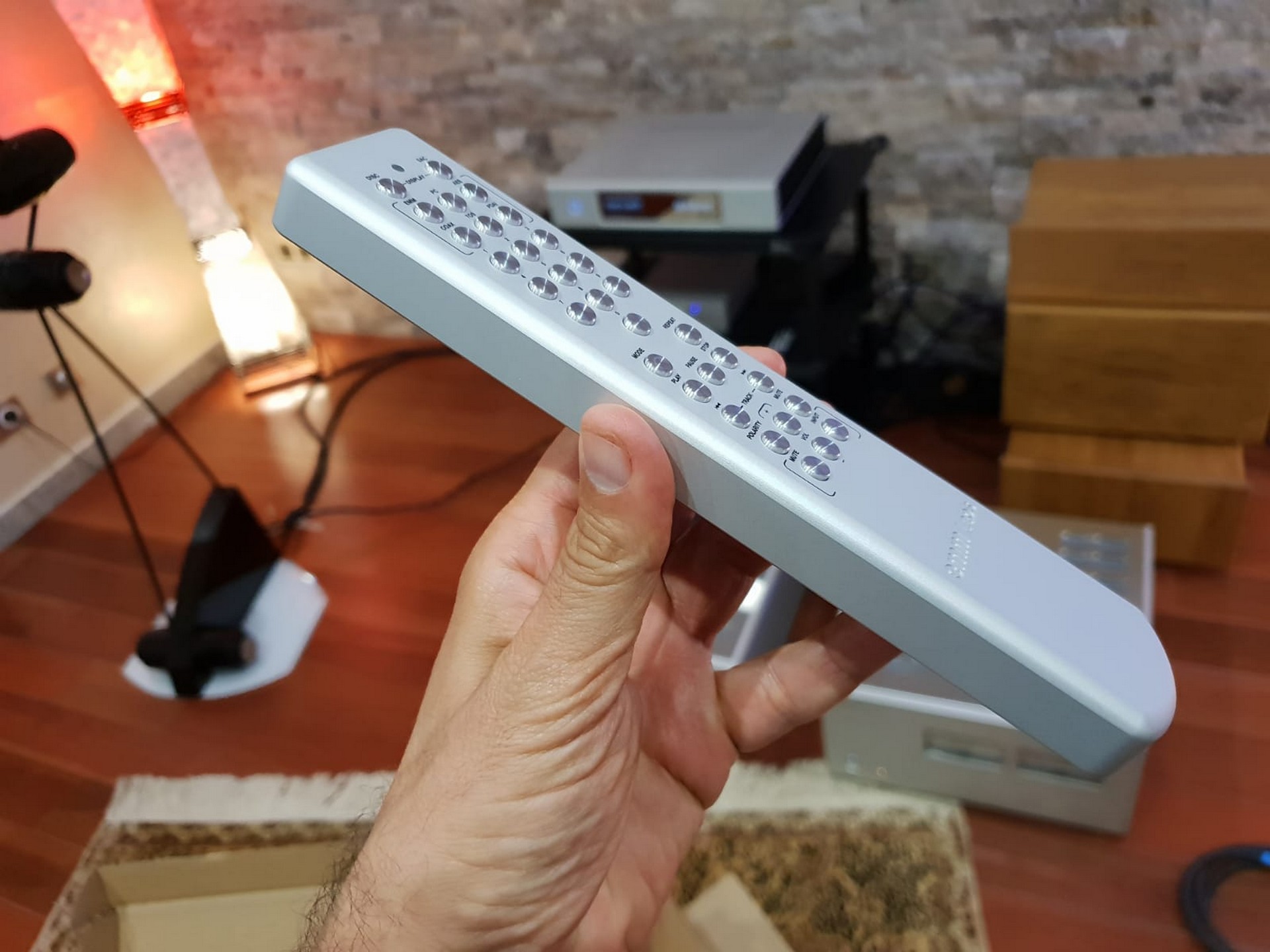 Deux petites attentions qu'on aimerait voir plus souvent: une belle télécommande en métal, et un câble secteur de belle section digne de la bête.