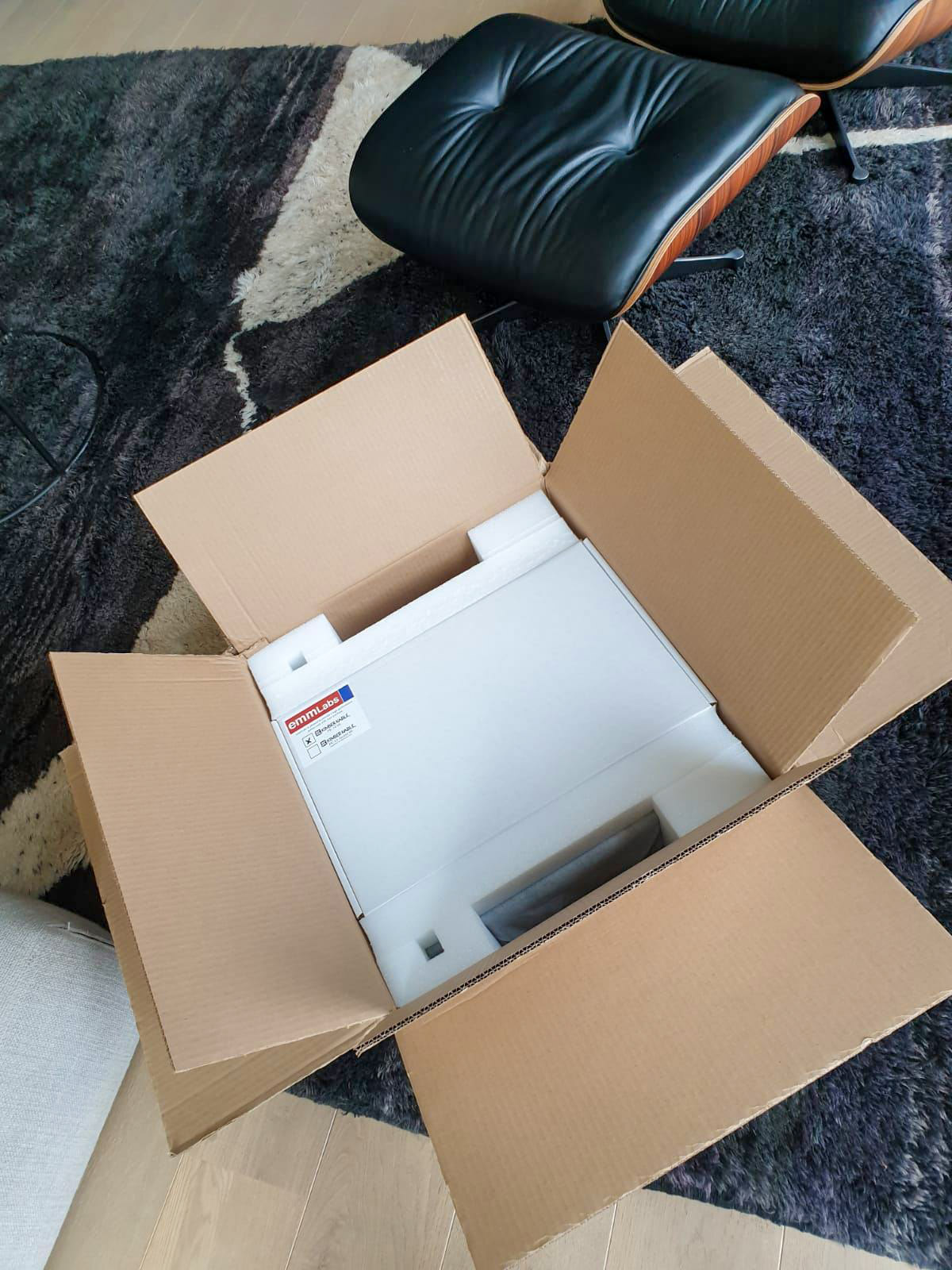 L'emballage est constituée d'un double carton bien épais et de mousse assez dense, garantissant un transport "secure".