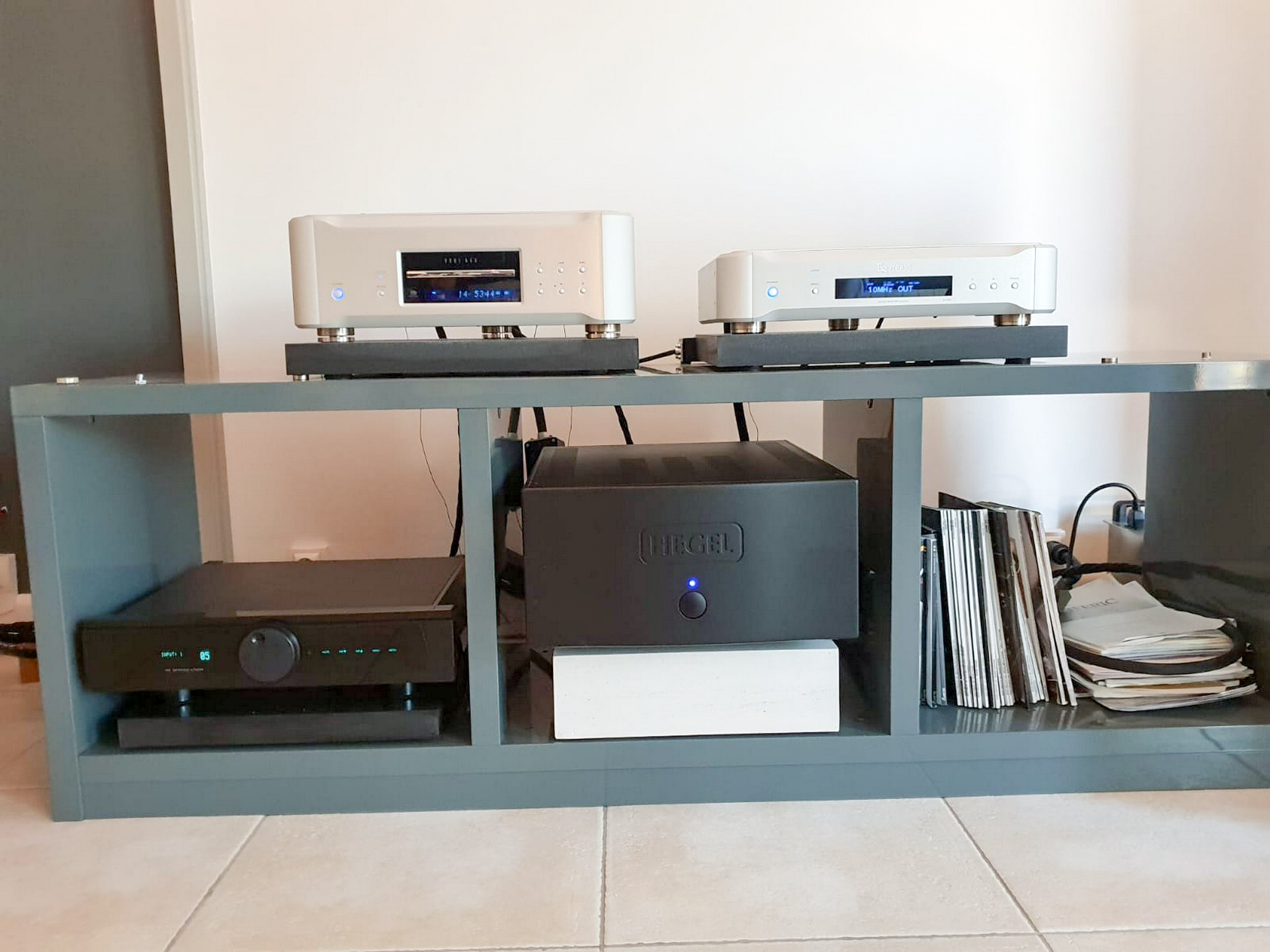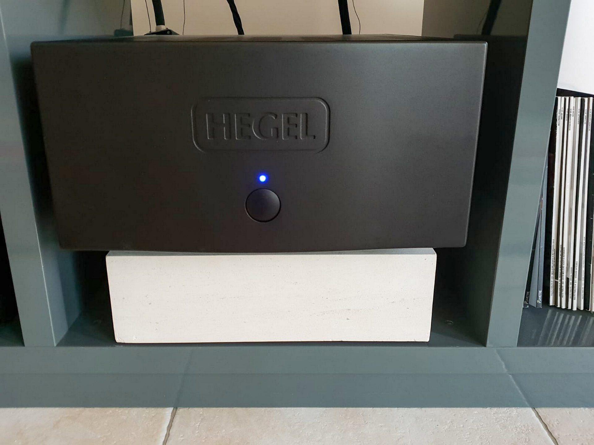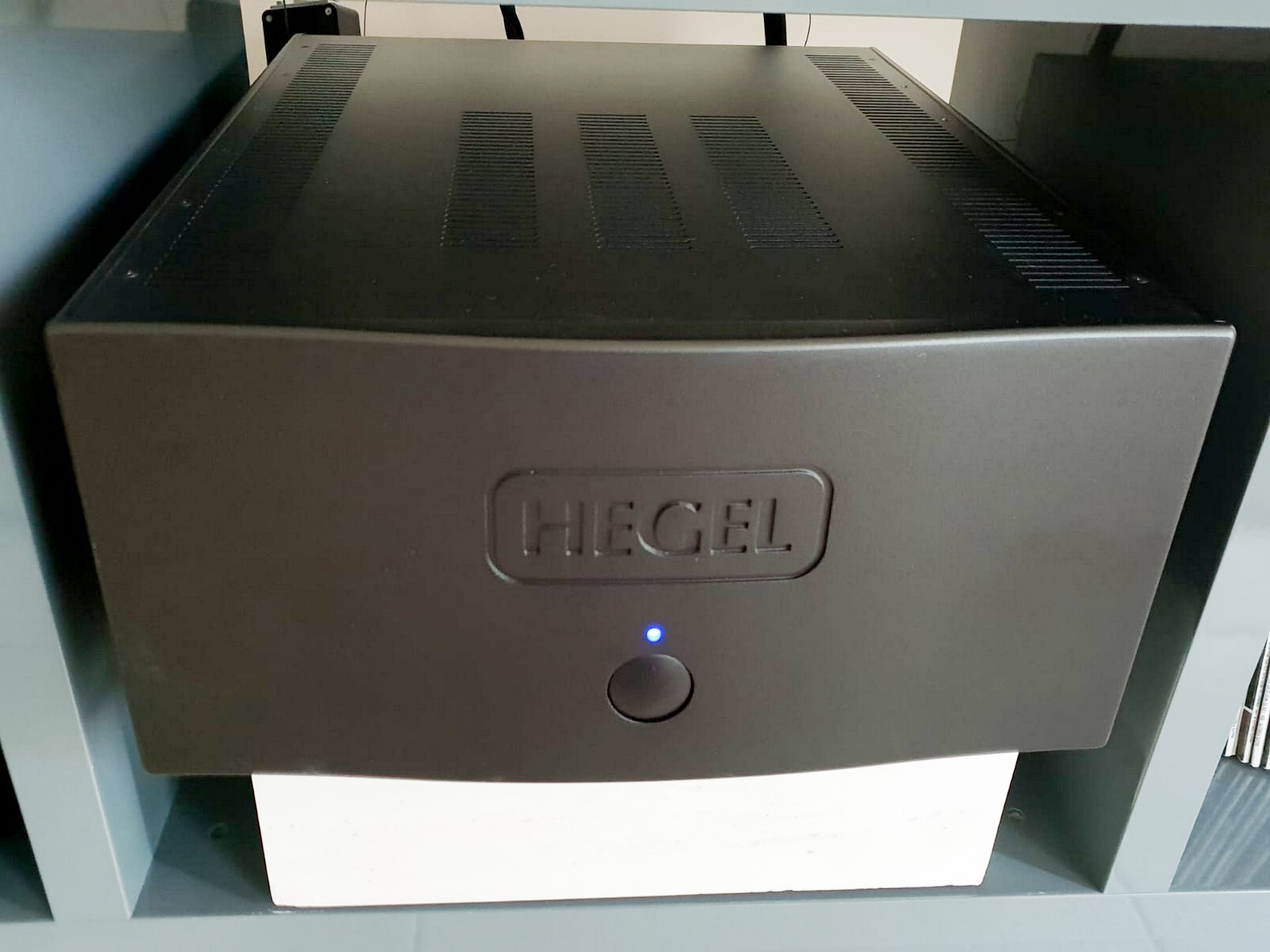 La partie amplification à été confiée a un bloc de puissance Hegel H30 aux qualités et dimensions gargantuesques. C'est le fleuron actuel chez Hegel en matière d'amplificateur. Il tient quasiment toutes les enceintes du marché, et même les fameuses Apogee Scintilla descendant sous 1 ohm, et au surnom explicite de tueuse d'amplis.