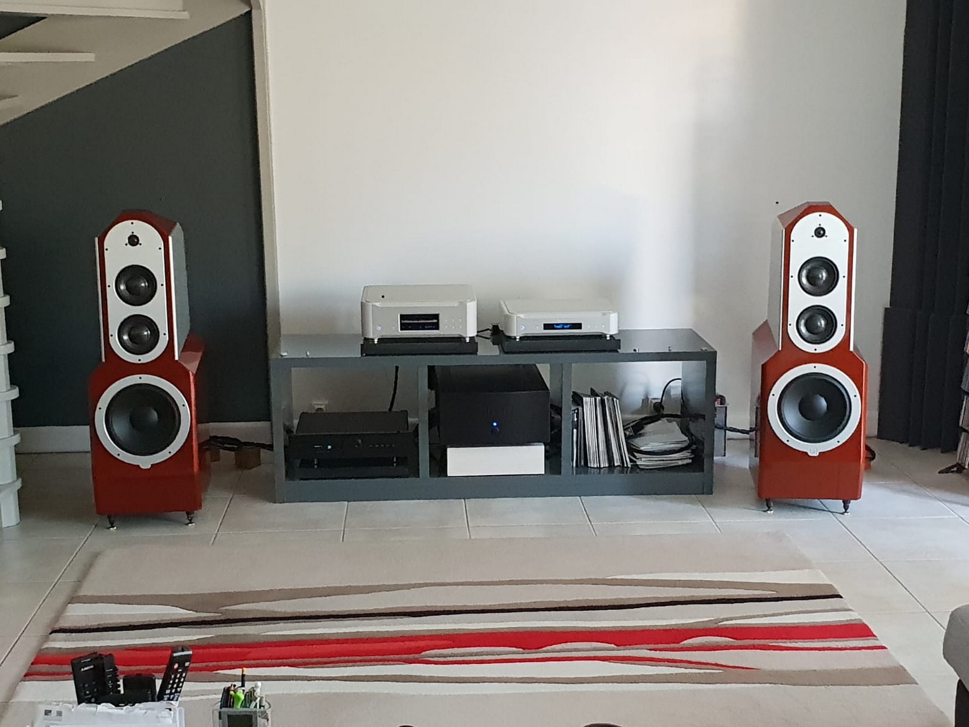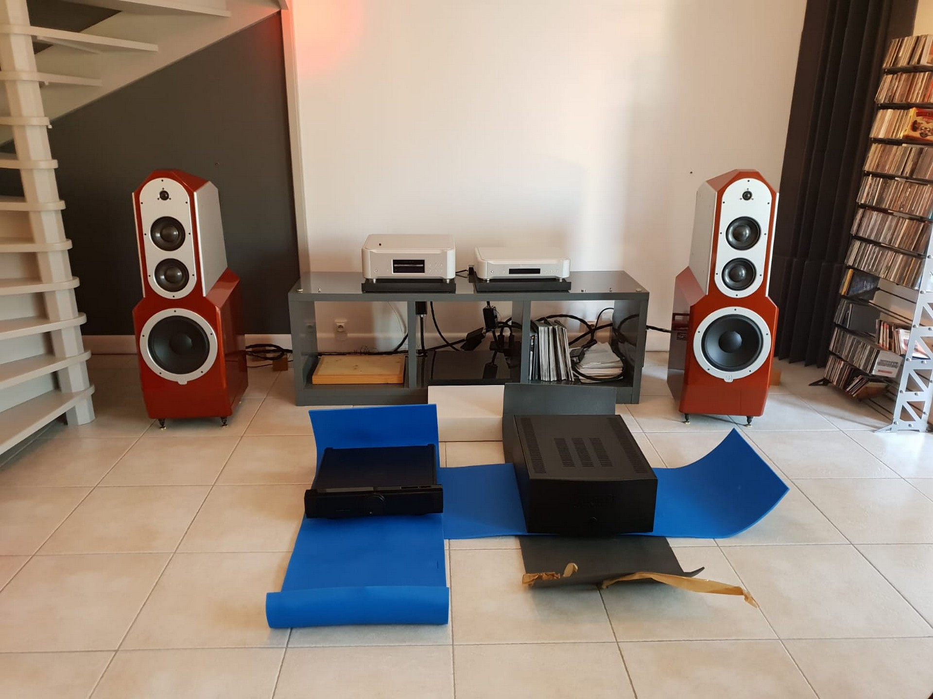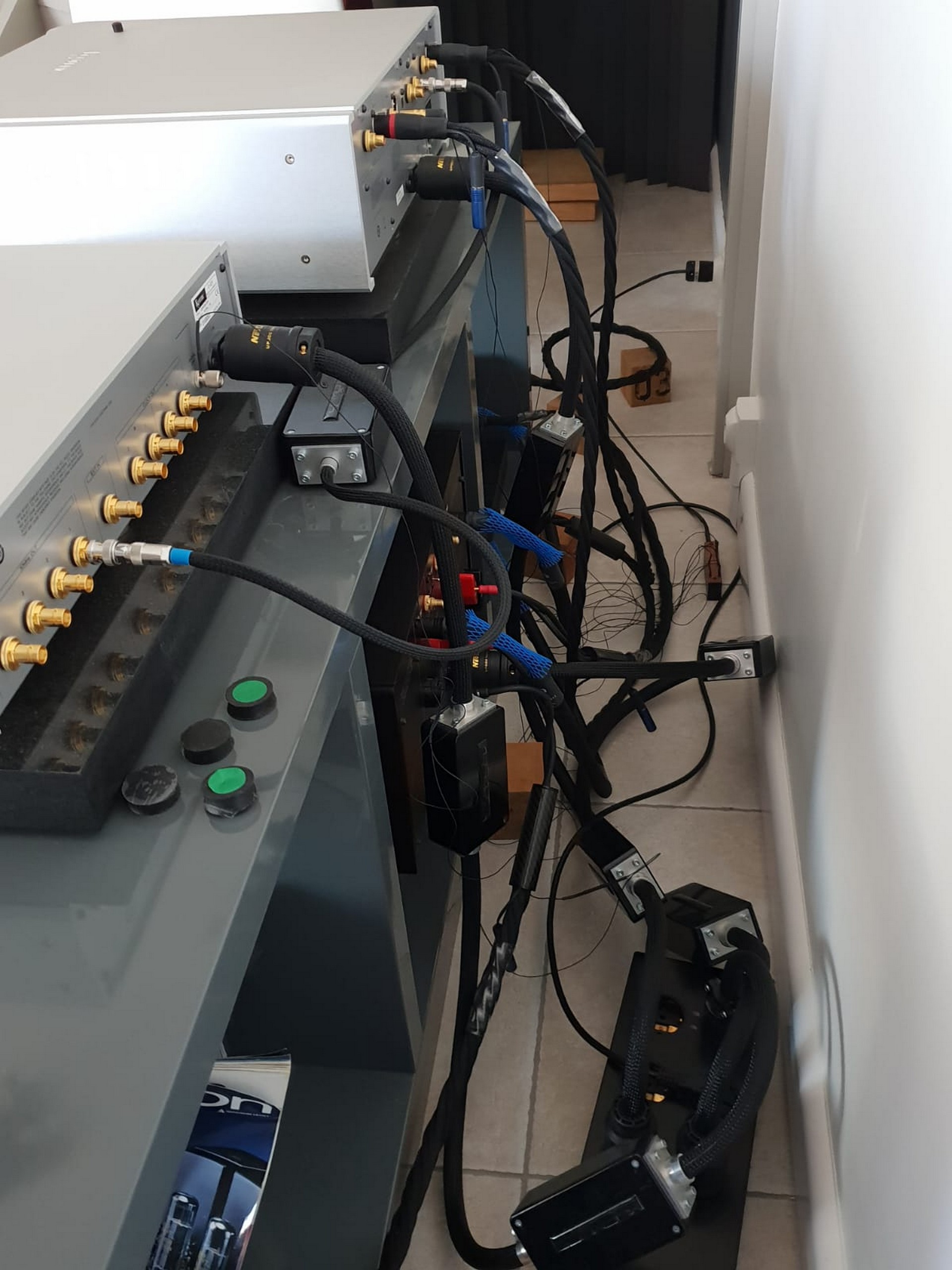 Rendez vous fut pris à son domicile, et nous nous sommes déplacés deux fois avec plusieurs électroniques de puissance et des préamplificateurs ainsi que du câblage, le choix final après écoutes s'est porté sur des valeurs sûres: