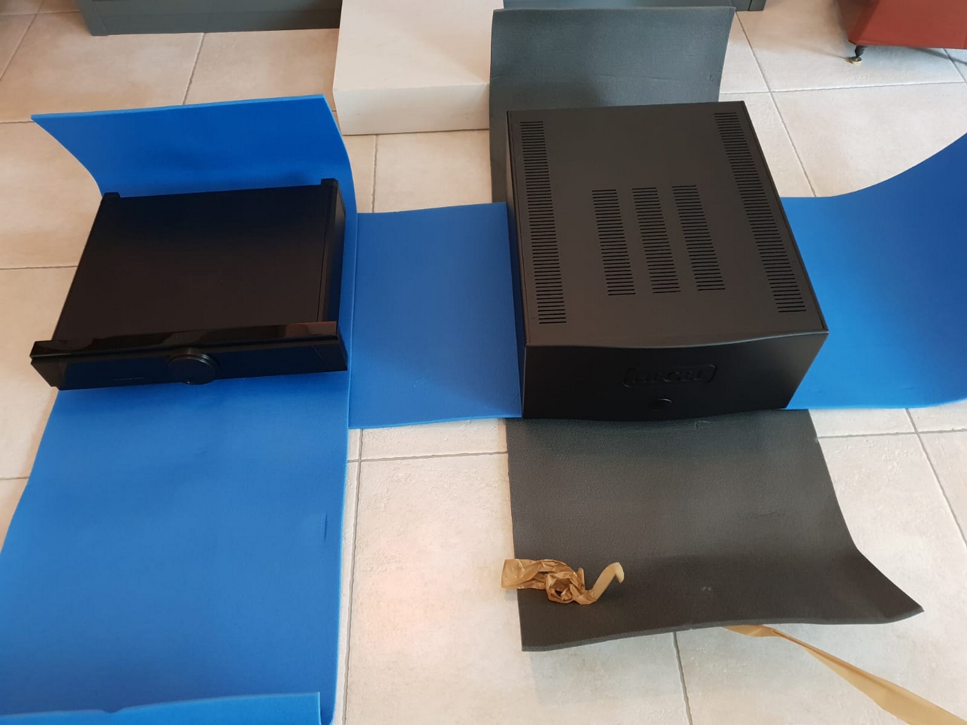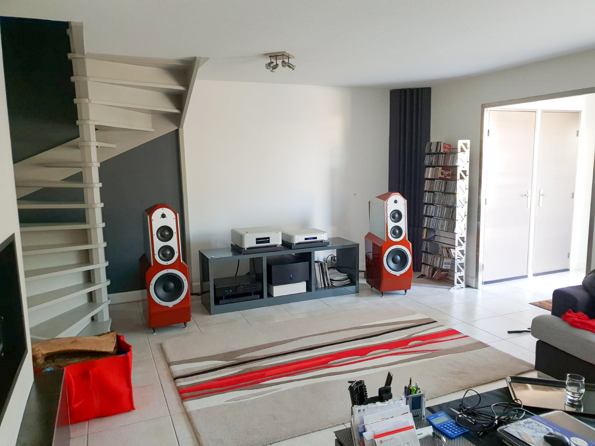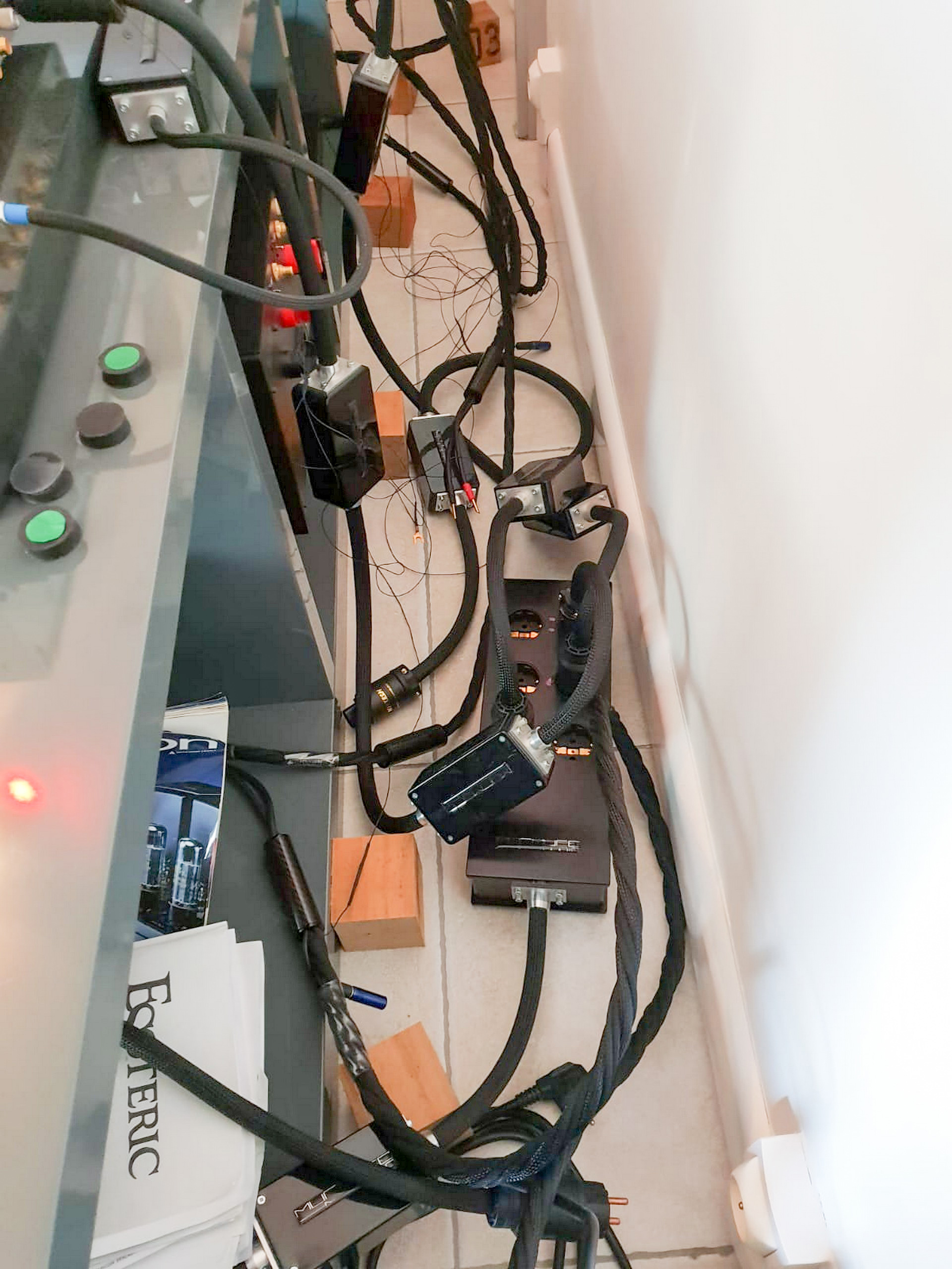 Rendez vous fut pris à son domicile, et nous nous sommes déplacés deux fois avec plusieurs électroniques de puissance et des préamplificateurs ainsi que du câblage, le choix final après écoutes s'est porté sur des valeurs sûres: