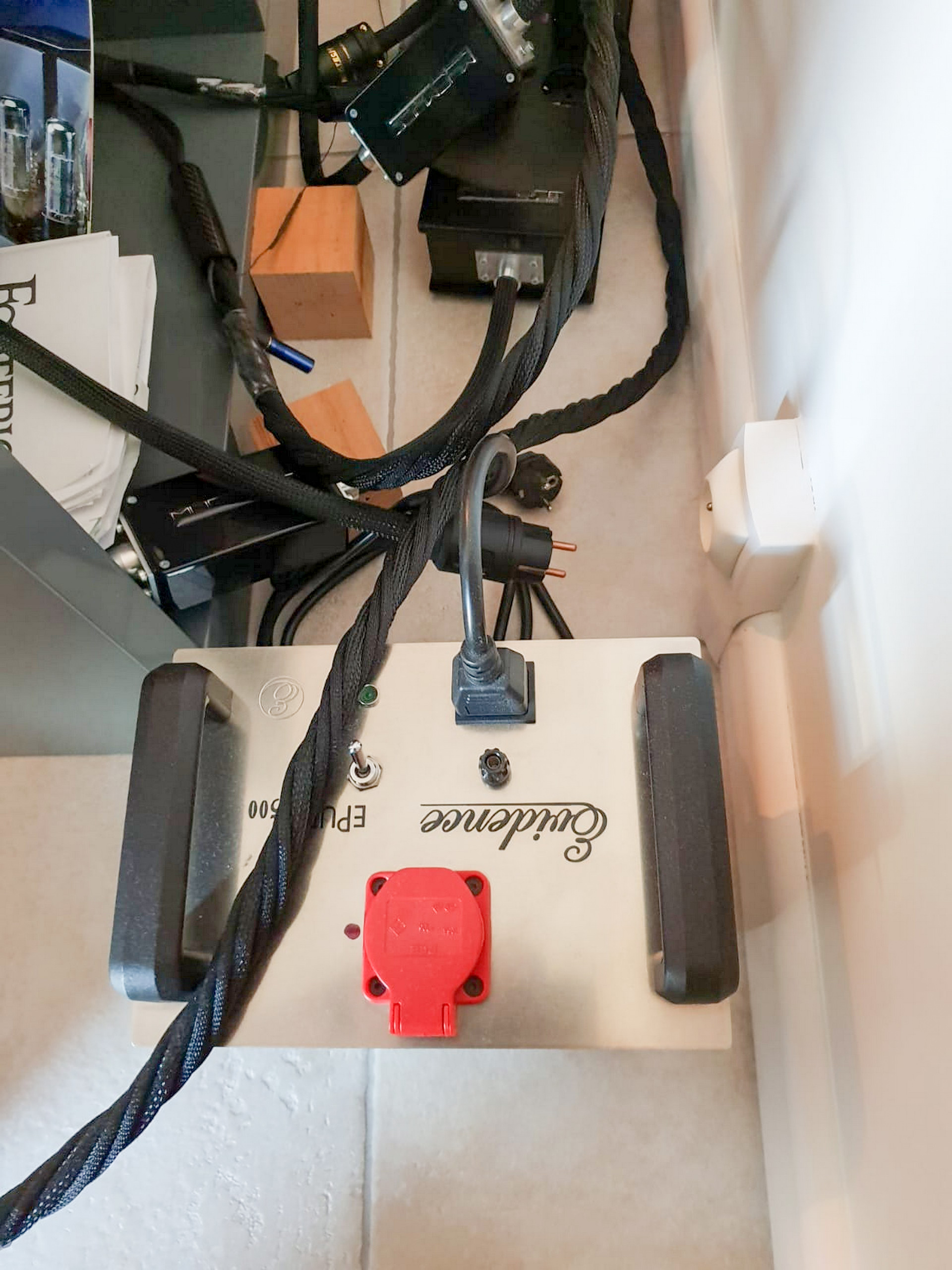 Un conditionneur secteur Epure se charge du courant secteur, ainsi qu'une barrette faite maison.