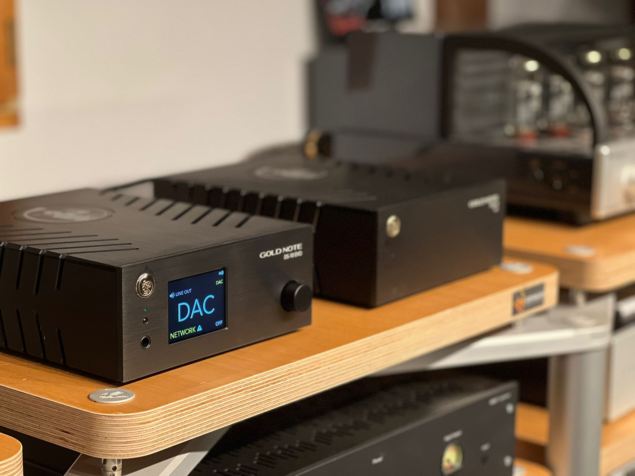 -sur un GoldNote DS-10 Evo (DAC-préampli-streamer-Bluetooth-Airplay, avec recours à Qobuz Connect en lecture réseau) comme source de musique, upgradé par l’alim externe optionnelle GoldNote PSU-10 Evo, pour la raison impérieuse autant que paresseuse que j’ai une écoute dans 2 heures de cette alim externe avec un client que nous avons déjà équipé du DS-10 Evo.