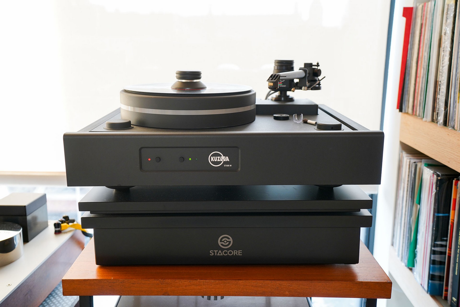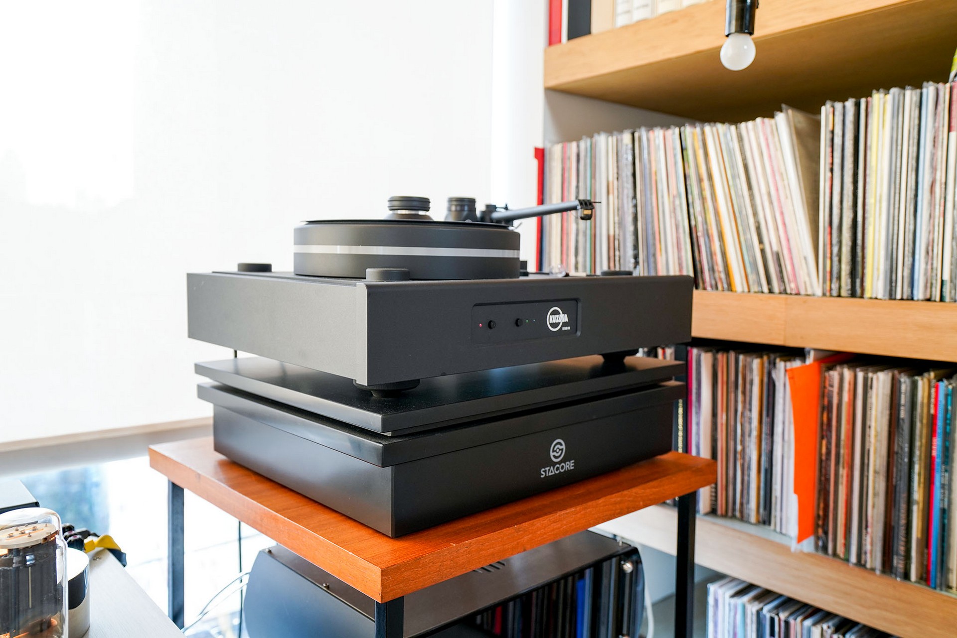 C'est un bras Kuzma 4 Point 14 pouces, véritable référence, qui survole la platine. Pour ce qui est de la cellule, c'est une autre référence qui a pour charge de décrypter les sillons avec le modèle haut de gamme Makadé de chez Miayjima. Celle ci est en bambou. Le câble phono quant à lui est un Lyra Phono Pipe.