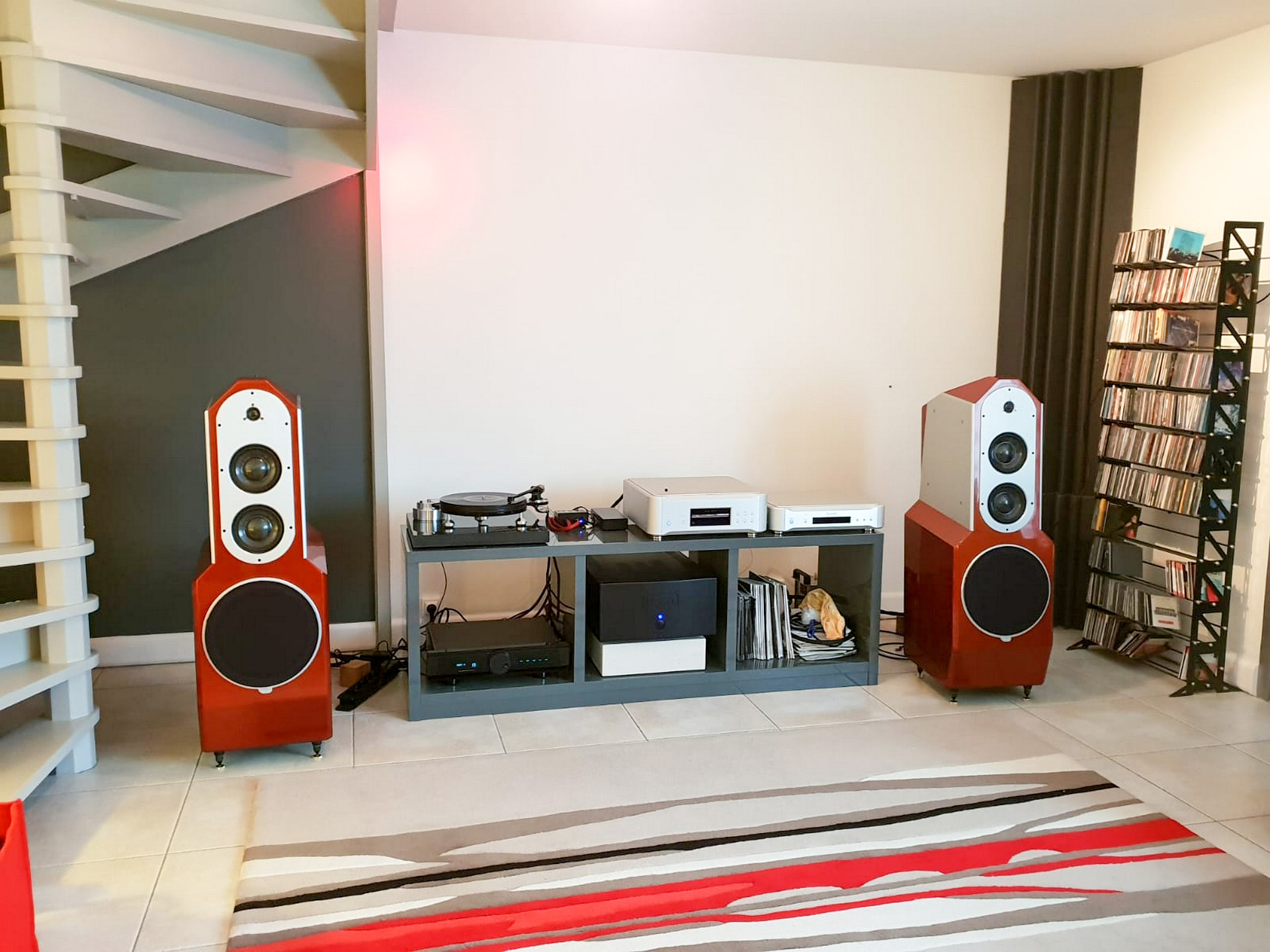 Marc est un de nos nouveaux clients avec qui nous avons opéré un upgrade d'amplification, il y a deux mois, avec un ensemble préamplificateur Gryphon Athena et un bloc de puissance Hegel H30, le tout cablé en Purist Audio, avec en source numérique un couple lecteur/horloge Esoteric sur des enceintes Egglestonworks Andra III.