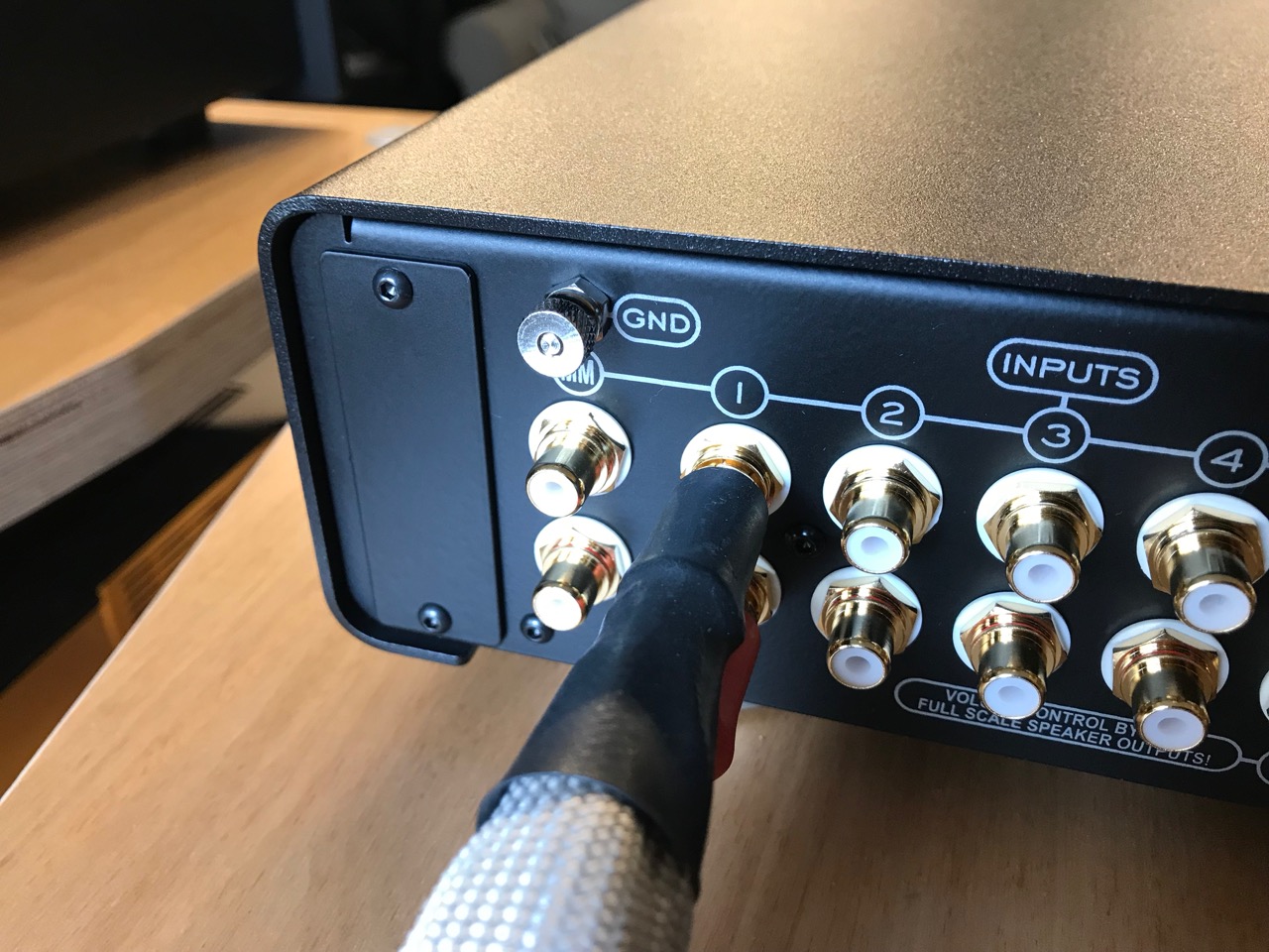 La connectique est riche: 5 entrées ligne, dont 1 by-pass ("home Theater") pour une intégration à un système multicanal, 1 entrée phono MM de belle composition, 2 sorties analogiques (fixe, et pré-out variable), 1 sortie casque -Jack 6,35 mm (250 mW sous 32 Ohm, 120 mW sous 120 Ohm, 30 mW sous 600 Ohm).