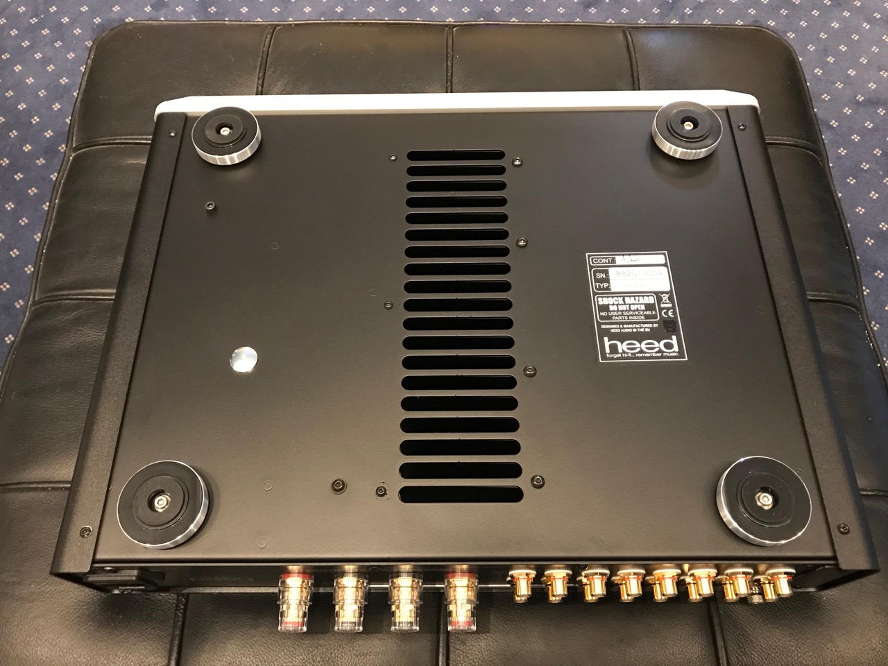 Ventilation en milieu de coffret: comme sur d'autres modèles de la marque, Heed équipe ses appareils de "radiateurs cheminée": les radiateurs internes qui servent au refroidissement des transistors forment des conduits traversants, sans contact avec l'intérieur, de sorte qu'aucun objet externe ne peut tomber sur les circuits par les trous de ventilation.