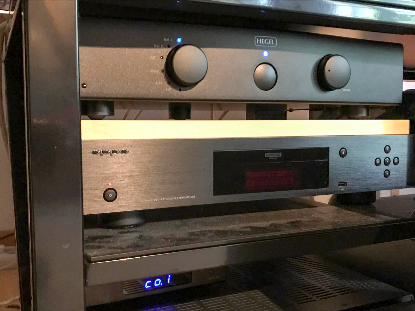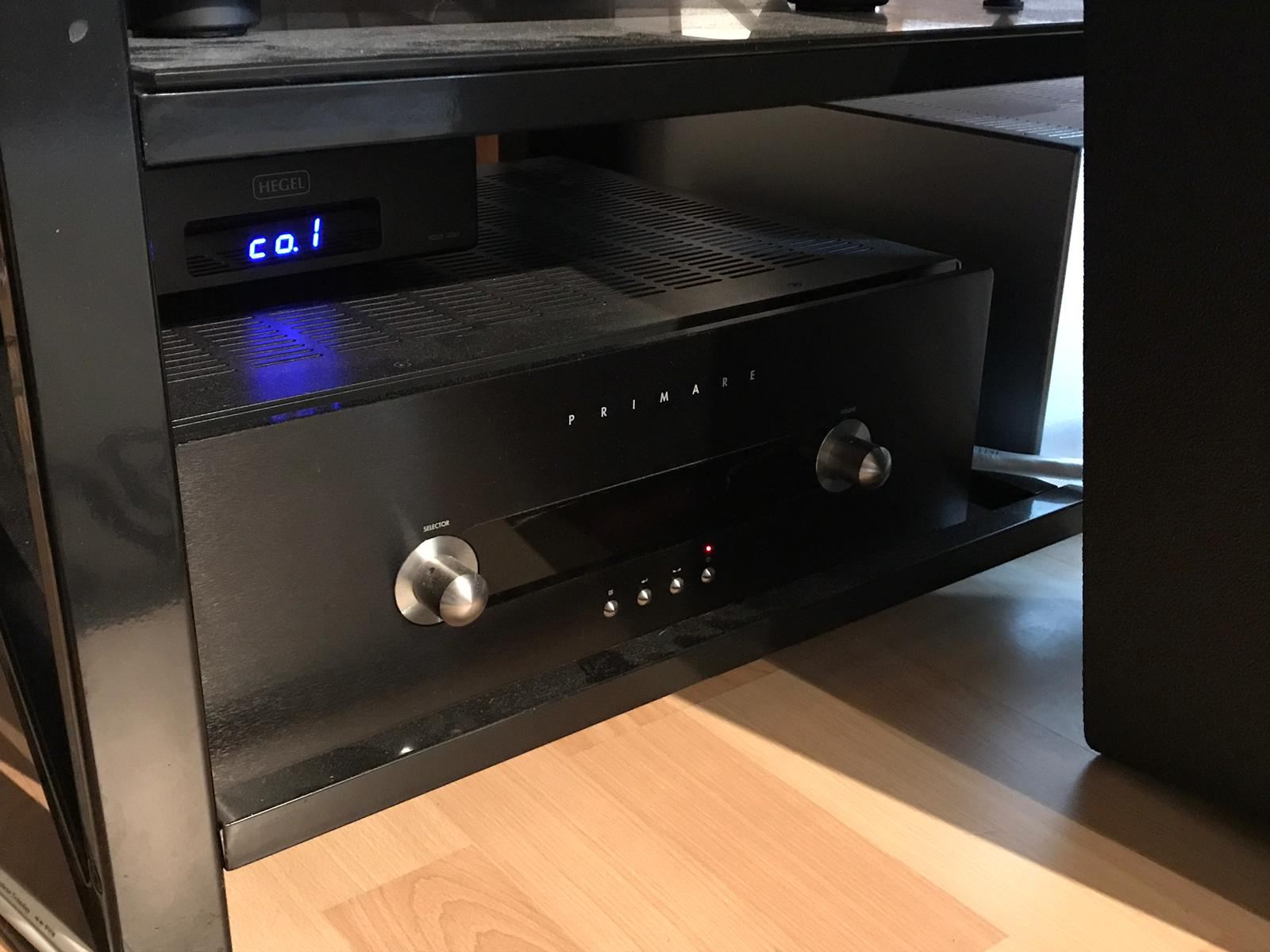En ce qui concerne la partie home-cinéma, c'est un amplificateur audio-video Primare SPA20 qui passe en by-pass via le préamplificateur Hegel P30. La lecture se fait sur un lecteur OPPO modifié.