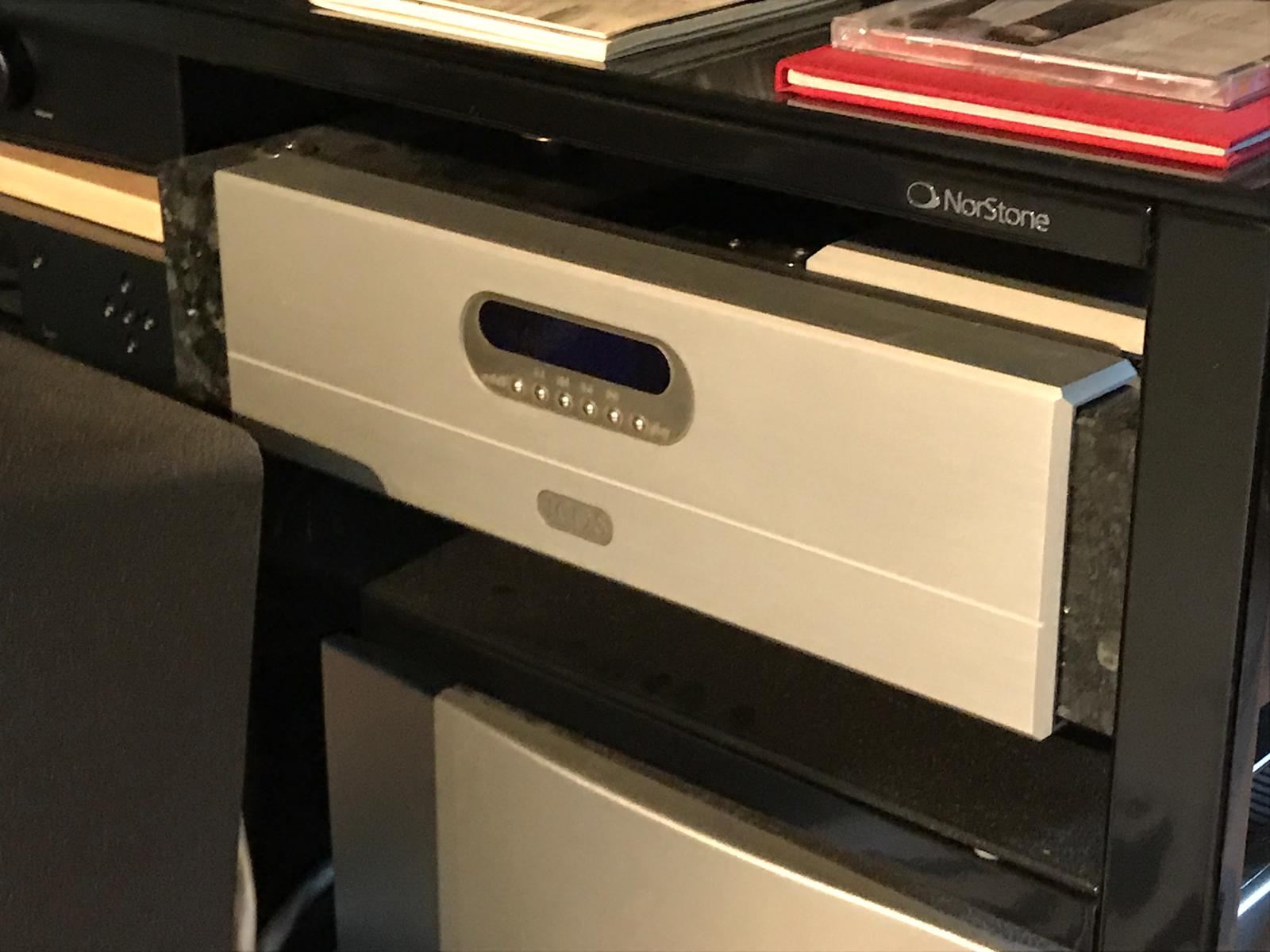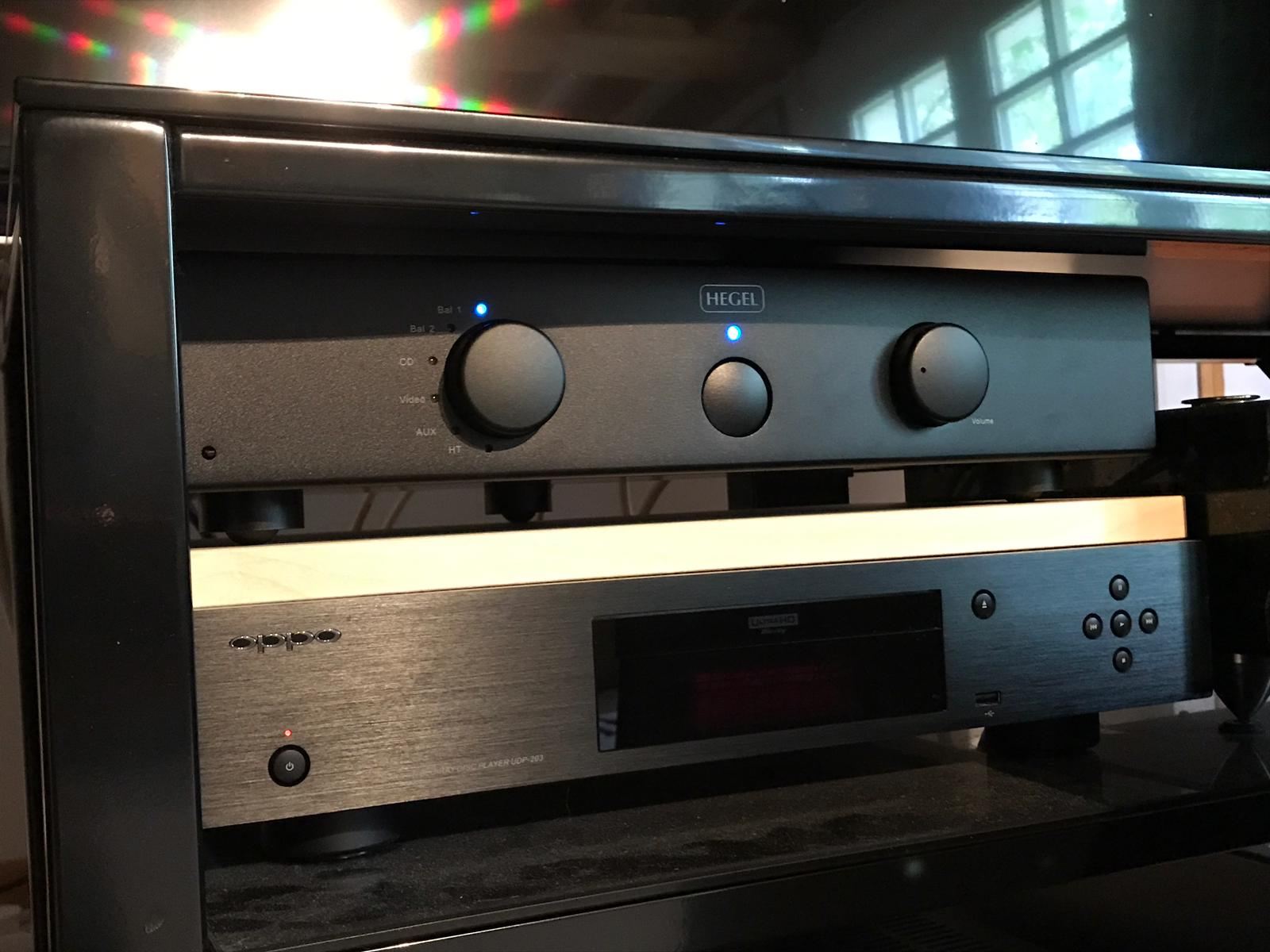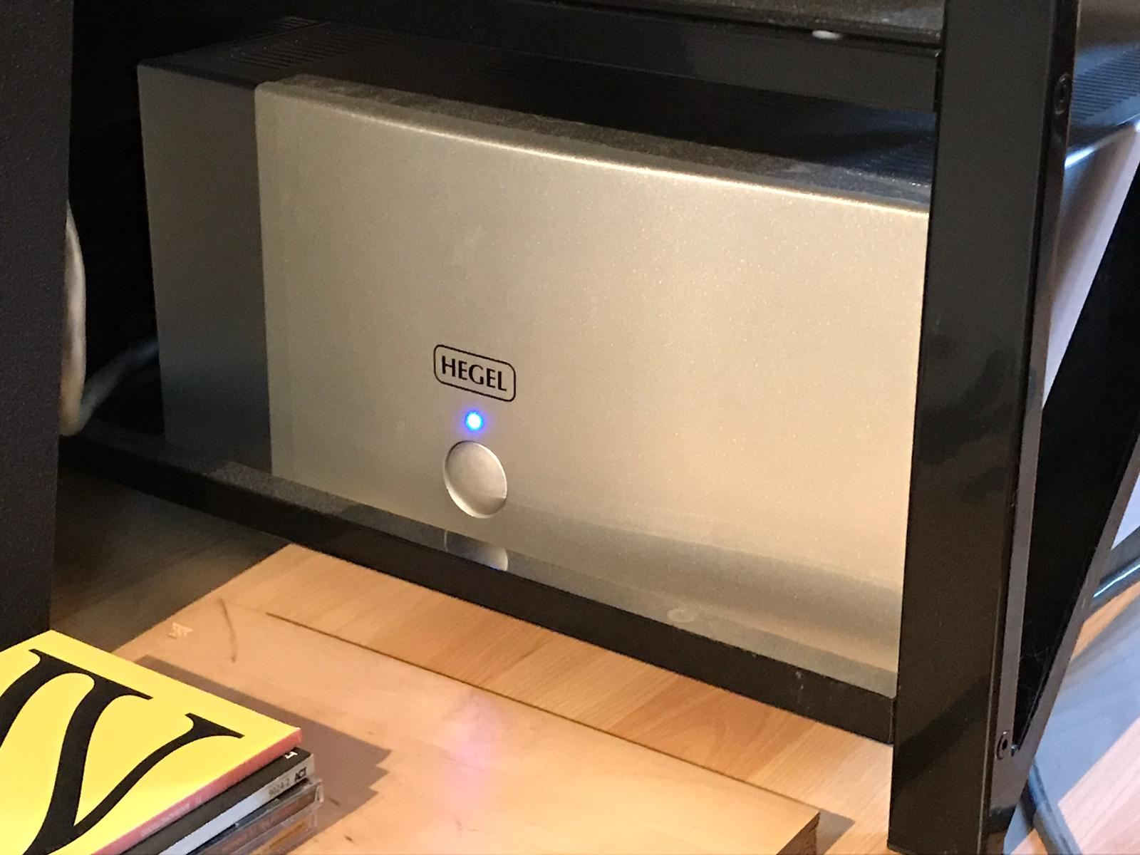 Le reste du système a été monté pas à pas au fil du temps; il se compose pour la partie HiFi d'un préamplificateur Hegel P30 qui pilote le gargantuesque bloc de puissance stéréo Hegel H4ASE. Le convertisseur fait appel à un Hegel HD25 qui décortique le signal du superbe transport CD ICOS Fado Drive. Le convertisseur devrait être amené à changer pour monter en gamme de restitution et décoder les formats dernier cri.