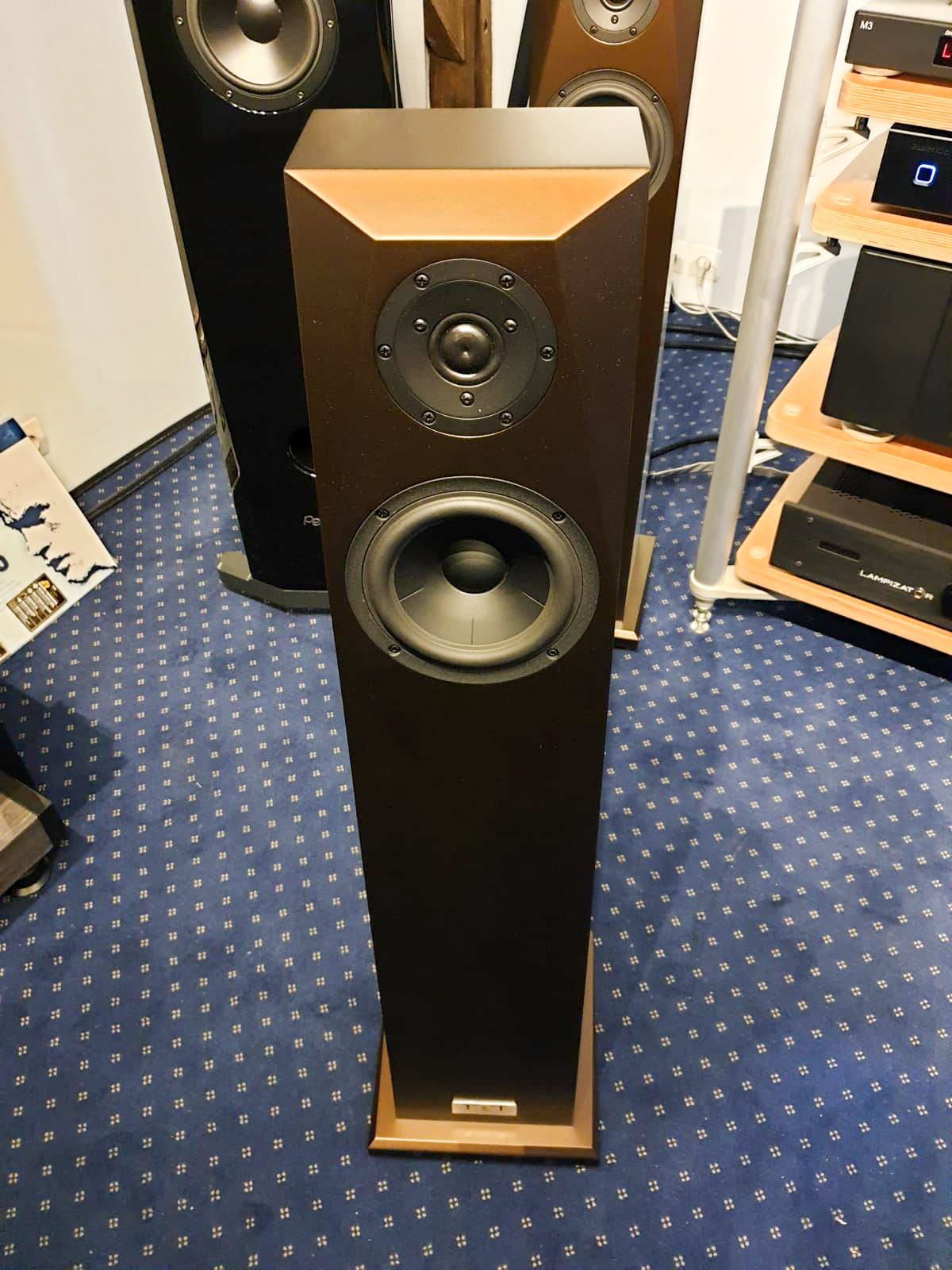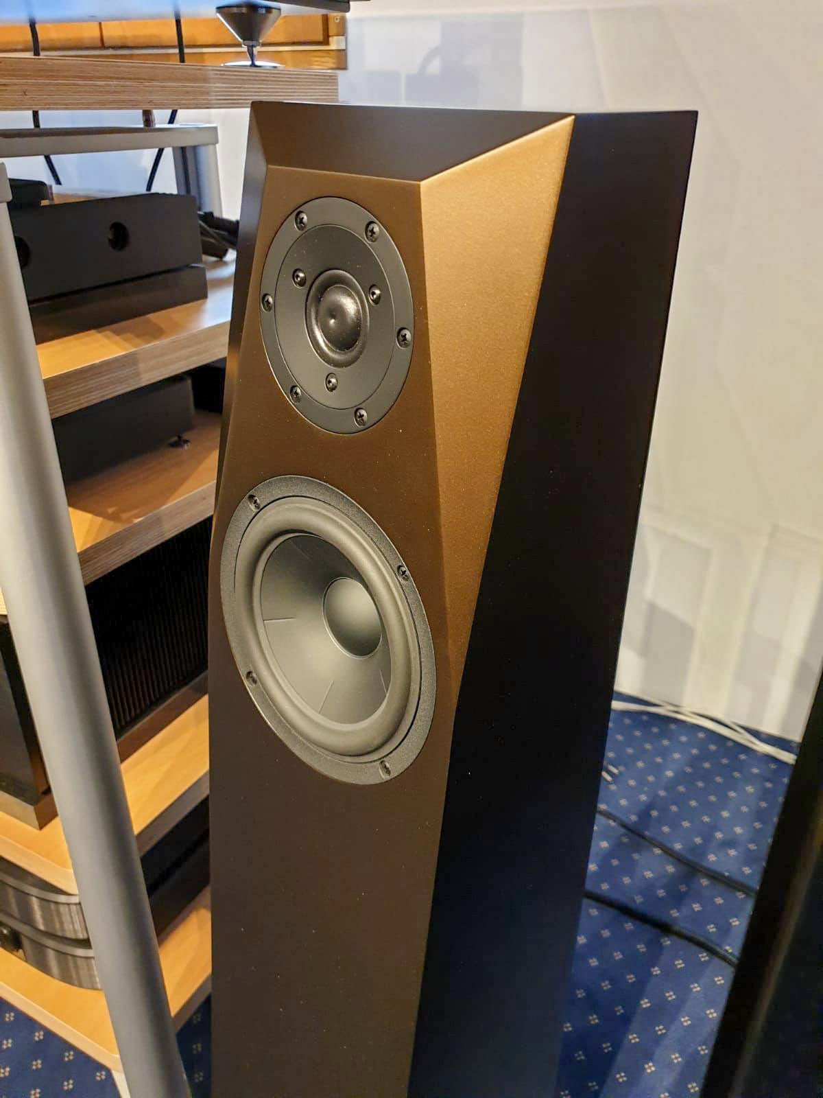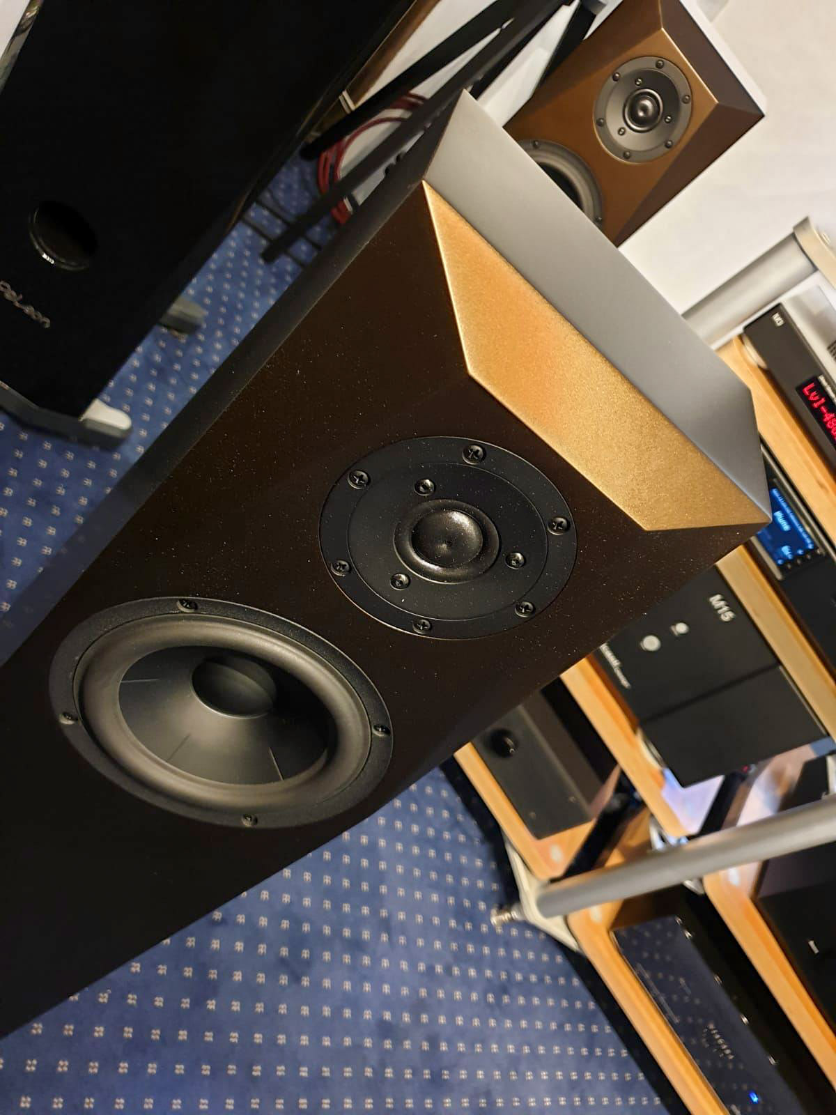 Nous sommes littéralement tombés sous le charme de la finition Marrakech, savant mélange de bronze, brun, doré et aubergine, qui nous rappelle certains tons d'enceintes Magico ou Kharma.
